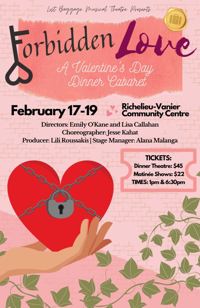 This year’s Valentine’s Day Dinner Theatre Cabaret is all about deep, foreboding passions. Forbidden Love features all your favourite taboo relationships from musicals like The Phantom of the Opera, Hairspray, West Side Story, The King and I, and The Bridges of Madison County. Local performers will take you on tales of relational triumphs and woes through a series of solo and ensemble performances. Whether you need a date night, a girls night, or a solo night, Forbidden Love is the perfect way to warm and liven up a cold February day! The show features a selection of solos, duets, and ensemble numbers with some scenes mixed in.