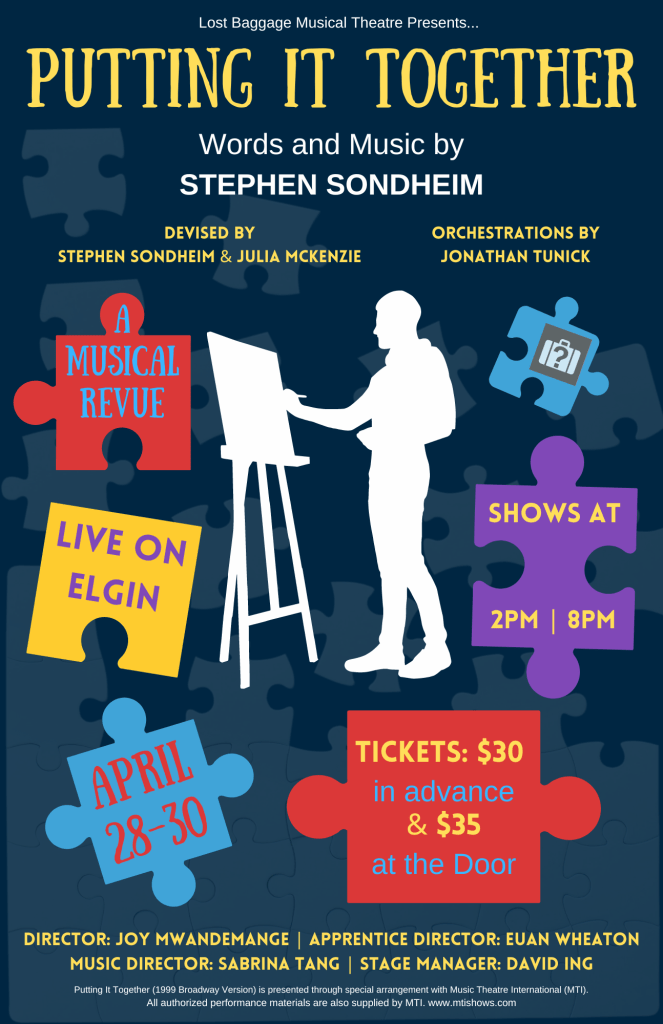 Putting It Together is a musical revue showcasing the songs of Stephen Sondheim (Sweeney Todd, Follies, A Funny Thing Happened…). Drawing its title from a song in Sunday in the Park with George, it celebrates Sondheim’s incomparable career in musical theatre.