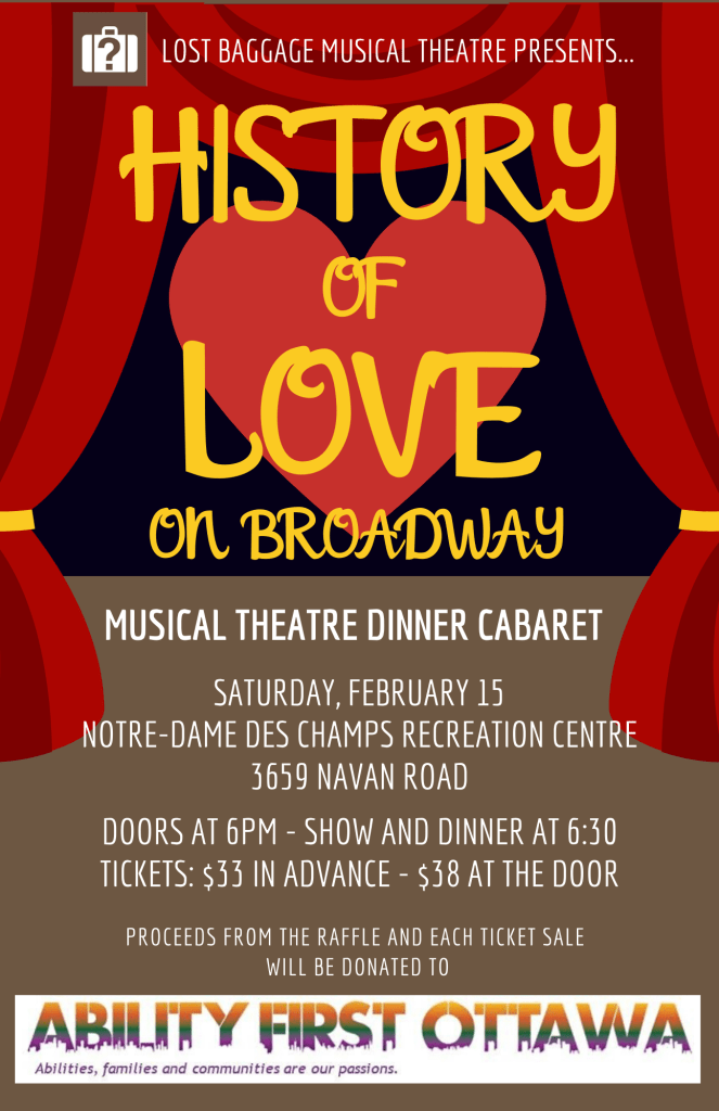 From “Guys and to Dolls” to “West Side Story” to “Rent”, every show has a love story! Experience your favourite musical theatre romances and songs decade by decade through Lost Baggage Musical Theatre’s “History of Love: On Broadway”. Guests attending the show will be treated to a three-course meal while being serenaded in between courses. A portion of the proceeds from the ticket sales will be donated to Ability First Ottawa.